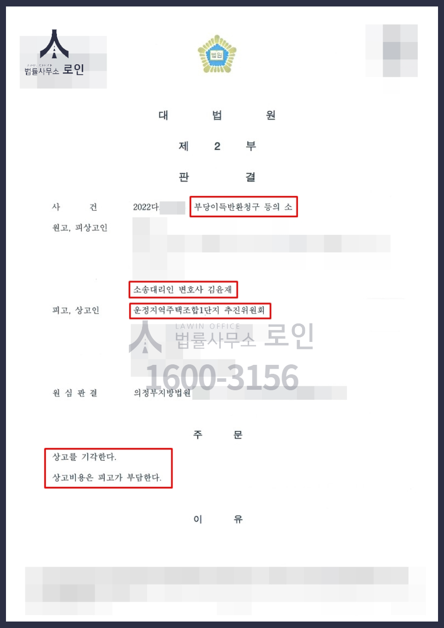 그 결과 대법원은 조합원 승소 판결을 선고했고, 의뢰인에게 분담금 전액과 지연이자를 반환하라는 대법원 승소 판결이 확정되었습니다.