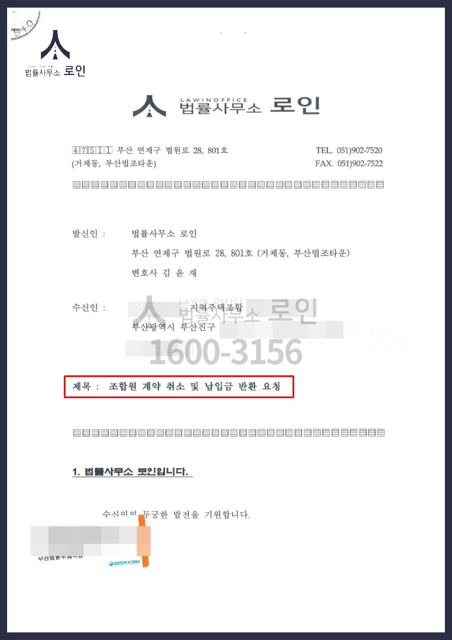 로인의 부동산전문변호사는 계약 취소 및 납입금 환불을 요청하는 내용증명을 발송하고 조합 측과 유선 협의를 진행했습니다.