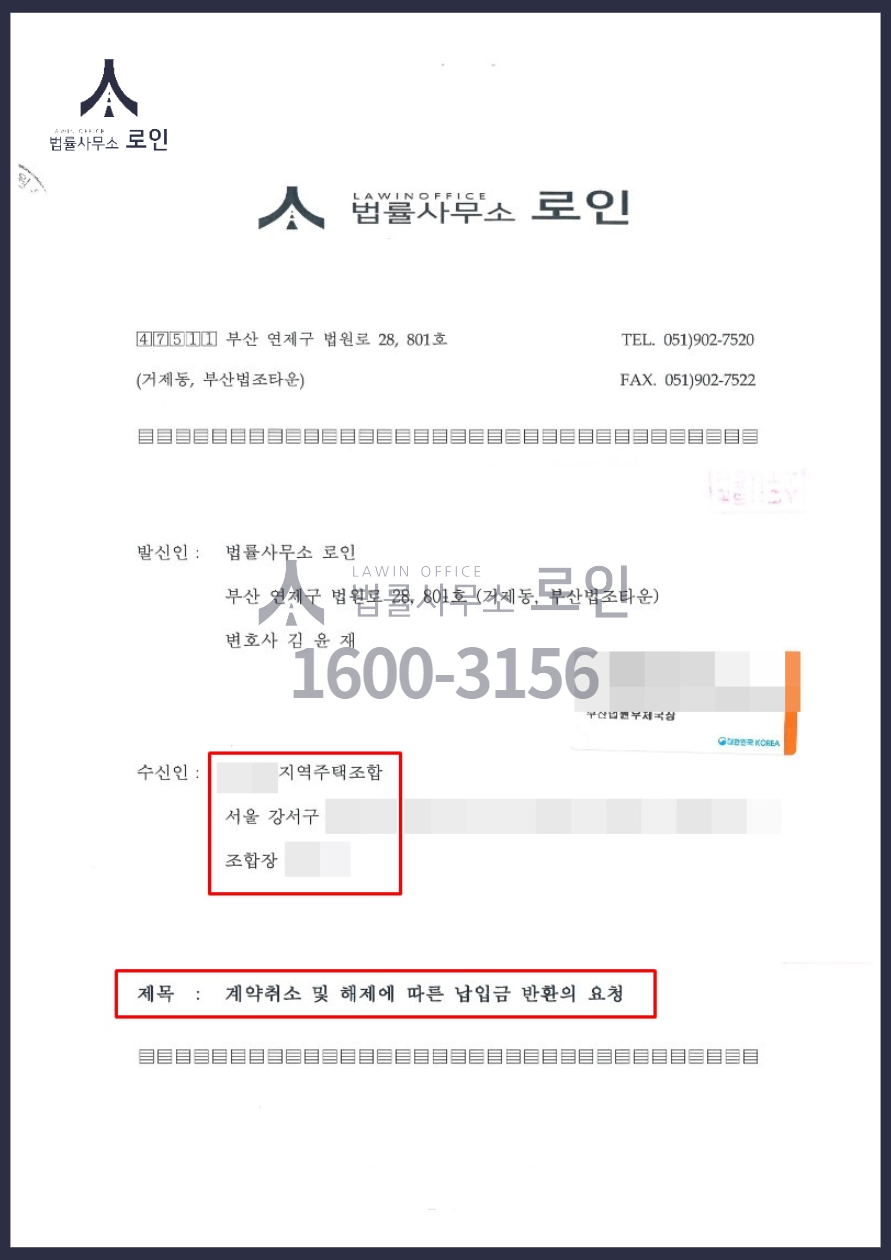 로인의 부동산전문변호사는 계약 취소 및 납입금 환불을 요청하는 내용증명을 발송하고 조합 측과 유선 협의를 진행했습니다.